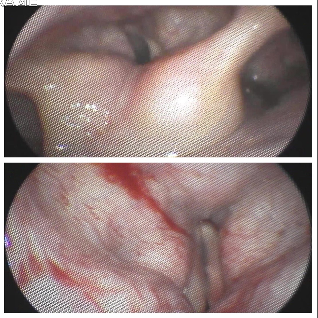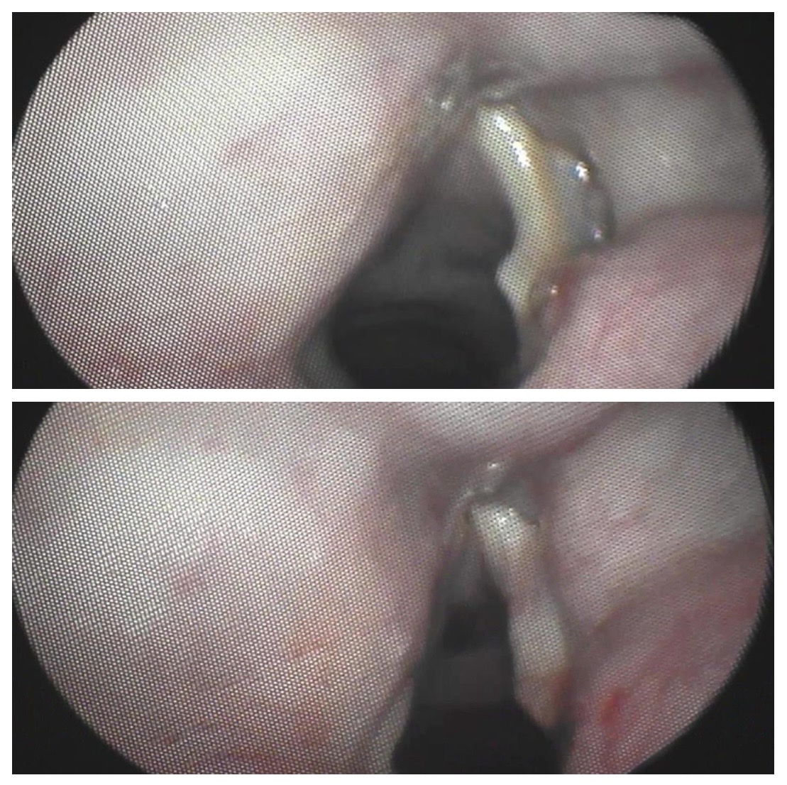 Ambas imágenes muestran antes y después de la medialización con ácido hialurónico del pliegue vocal derecho paralizado. Se observa la rectificación del mismo.